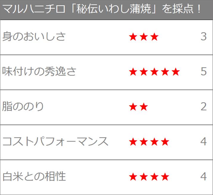 筆者、マルハニチロの回し者でも何でもないのですが、蒲焼き部門でも同社商品が素直においしいと思いました。ちなみに、マルハニチロは商品群が豊富なのも特徴で、蒲焼きは「いわし蒲焼」という“秘伝ではない”タイプもあります。それを凌駕するウマさを感じたのがこれ、「秘伝いわし蒲焼」。