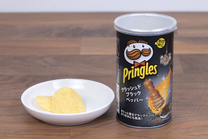 1品目は、「クラッシュドブラックペッパー」。ポテトのおいしさを引き立てるブラックペッパーの風味が特徴だ。ちなみに、プリングルズのパッケージには擬人化したポテトチップが描かれており、フレーバーごとにイラストが異なるのがおもしろい。