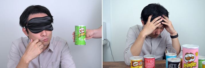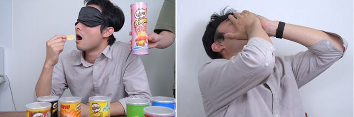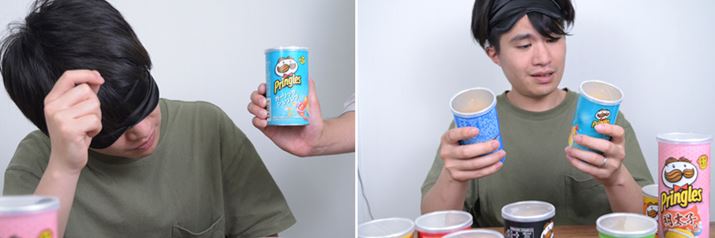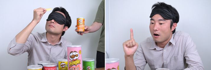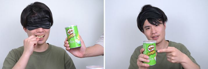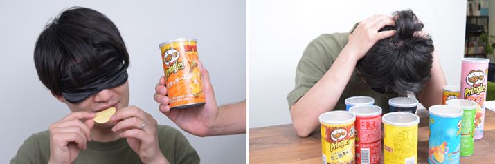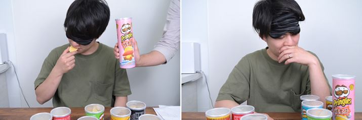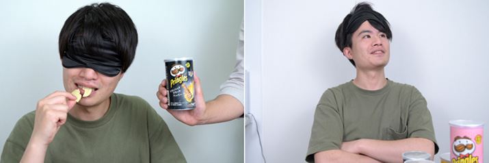 9種類のフレーバーを整理できたところで、さっそく利きプリングルズを始めるとしよう。ルールは簡単。目隠しをしてプリングルズを1枚食べ、フレーバーを当てるだけである。挑戦するのはスタッフKとスタッフNの2名で、プリングルズ歴は両名ともに「物心ついた時から」だそう。これまで食べたことのあるフレーバーは、「うましお味」「サワークリーム&オニオン」の2種類のみ。プリングルズ好きを名乗るには100年ほど早いが、味の再現度をチェックするのがこの企画の趣旨なので、初めて食べるほうが適任と言えるだろう。
