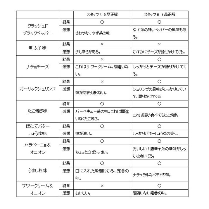 「明太子味」以外は着々と正解を積み重ねてきたスタッフN。最後の1枚を食べ終わると、アイマスクを外し、カメラ目線で「『サワークリーム&オニオン』」。スタッフKの結果が結果なだけに、8品正解は大健闘と言えるだろう