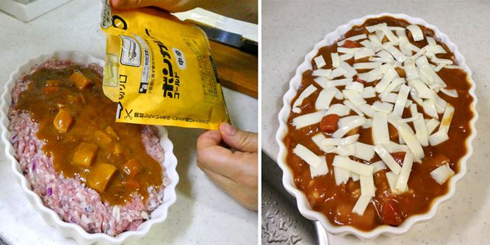ポテトの上に挽肉をみっちり引いて、温めたボンカレーゴールド(中辛)をかけます。そこにスライスチーズをトッピング