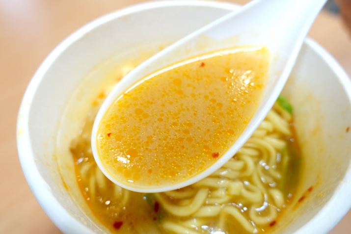 まずは、気になる辛味噌スープのクオリティから。後入れの液体スープの袋に辛味噌が入っており、これをかき混ぜることで、スープ全体がトロトロしてきます。最初はサラサラしすぎかなと思っていましたが、そのうちに辛味噌がなじんできて、最終的には、お店のスープと変わらない舌触りになってきました。