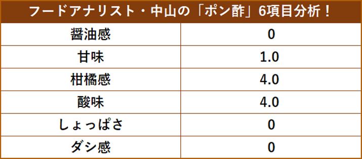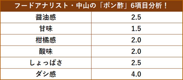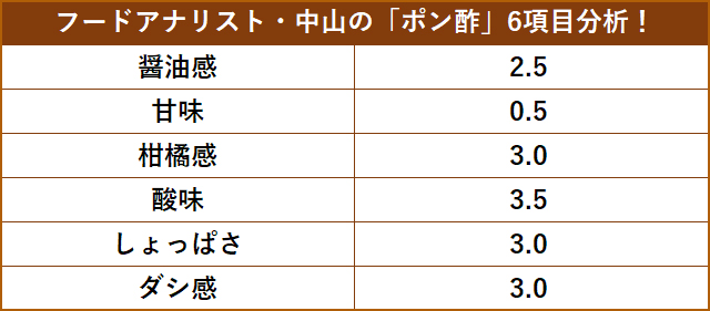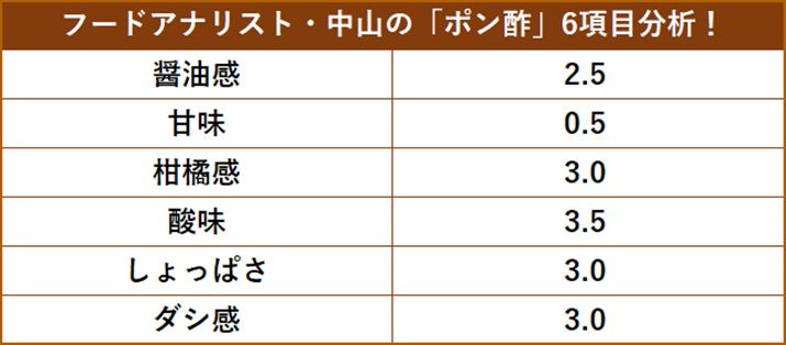 醤油が強めで、ダシ感は皆無。酸味はやわらかくソフトな感じで、トガった柑橘感がない分、ポン酢の中では入門編という印象です。「ご当地系や生搾りなどいろんなポン酢醤油はありますが、これがど真ん中ですよ」と言わんばかりの説得力があり、ロングセラーというのも納得できます。