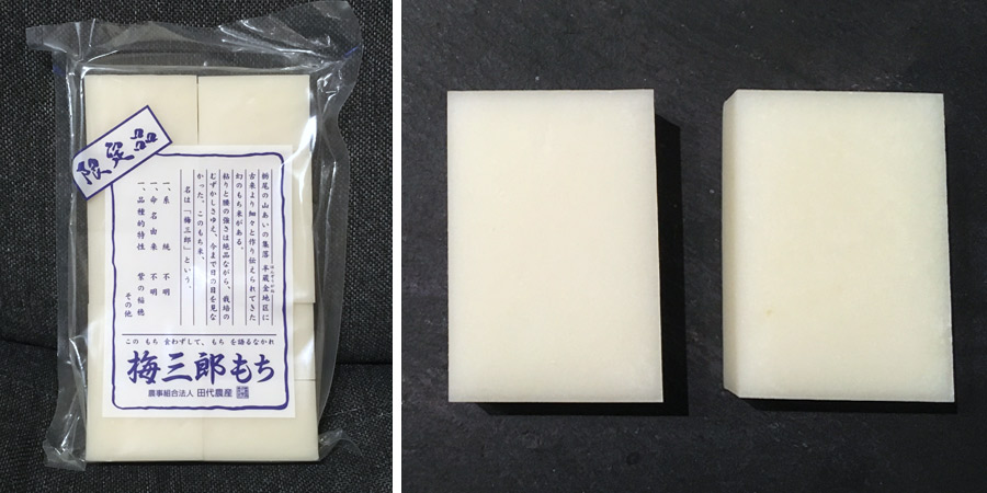 新潟の山奥で古来より細々と作り伝えられてきた幻のもち米「梅三郎」。お餅にすると、特有の香りとなめらかな舌触りが特徴で、「このもち食わずして、もちを語るなかれ」と言われるほど。スリットなどはなく、表面がさらっとしていて見た目は昔ながらのお餅です!