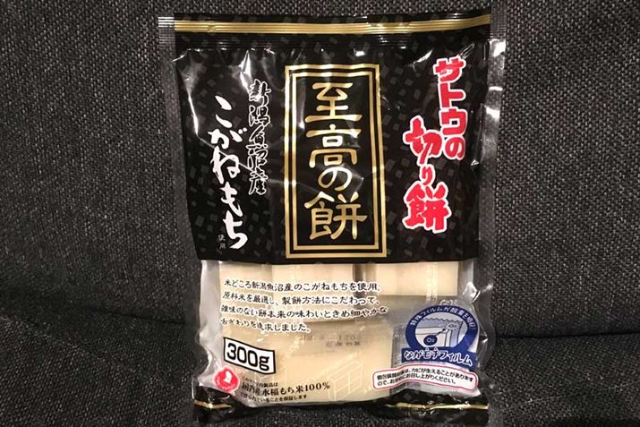 「サトウの切り餅」には、さまざまなラインアップがあり、こちらの「サトウの切り餅 至高の餅」はその高級版といった感じでしょうか。もち米の中でも最もおいしい銘柄のひとつと言われる、新潟県魚沼産こがねもちだけを使用しています。サトウの切り餅と同じく、個包装で「ながモチフィルム」を使用でお餅には十字のスリット入り。