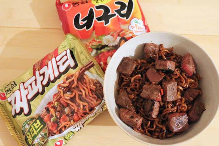 チャパグリは、韓国で大人気(というか定番)のインスタント麺、「チャパゲティ」(韓国風ジャージャー麺)と「ノグリ」(辛いラーメン)を組み合わせて作ります。チャパグリの歴史は古いそうですが、2013年に人気芸能人がテレビ番組で紹介したのをきっかけに大流行し、今や韓国では誰もが知る人気アレンジメニューなのだそう。ちなみに、「チャパゲティ」と「ノグリ」を販売している農心は、日本でも人気の「辛ラーメン」のメーカーです。