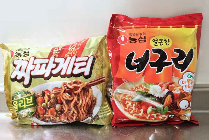 「チャパゲティ」(左)と「ノグリ」(右)。「チャパゲティ」ってかわいいネーミングですね。「ノグリ」は韓国語で「タヌキ」。パッケージ右下にはタヌキが描かれています