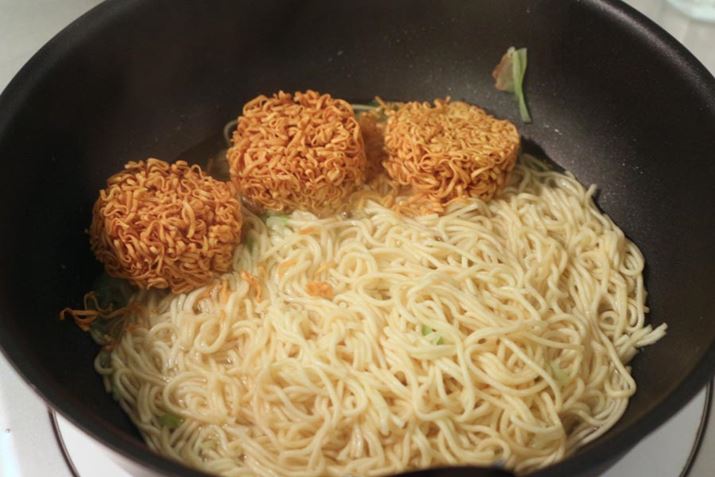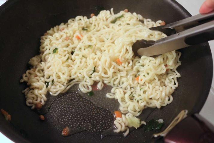 3.麺にスープを加え、炒め混ぜる