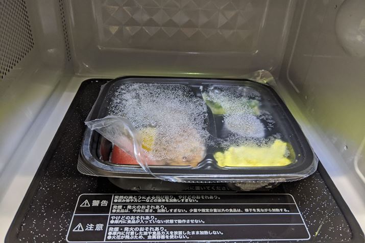 外ケースを外し、蒸気を逃がすためにフィルムの角を少し開けて、電子レンジにセット。500Wなら6分30秒〜7分、600Wなら6分〜6分30秒温めればできあがり!