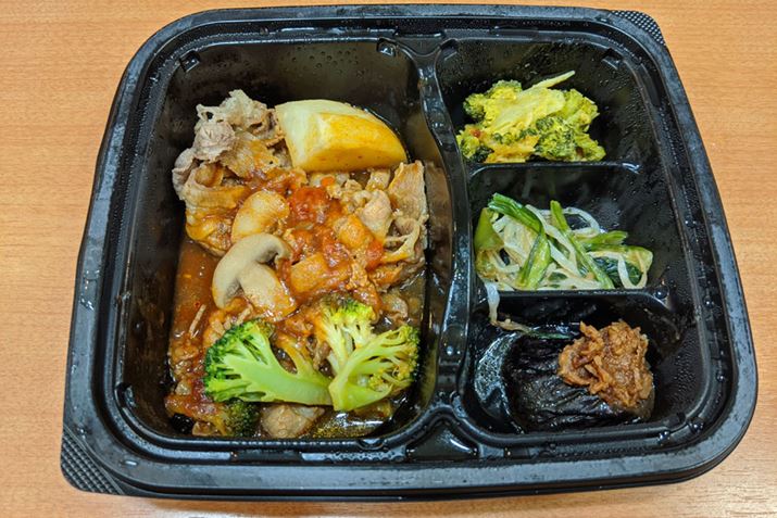 2日目のメニューは、ビーフ系の「総菜セット・牛肉のデミグラスソース煮」(338kcal)。作り方は同じなので割愛するとして、こちらはビーフとデミグラスソースの香りがこれまた食欲をそそる! 付け合わせの副菜も量は少ないものの、どれも塩分少なめでもしっかり食べられるようにカレースパイスなどの風味がつけられており美味。肝心の牛肉も実においしく、やわらかい。正直、ご飯ください!と思うが、ここはグッと我慢だ。