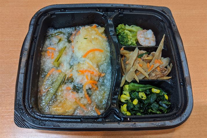 この日チョイスしたのは、初の魚系メニュー「総菜セット・白身魚の南蛮おろし煮」(215kcal)だ。これまでのメニューもカロリー数は低かったが、このメニューはなんと200kcalちょっとと、なかでも低カロリーである。南蛮おろし煮というのは、単純に言えば、魚のフライに大根おろしをかけたようなもの。白身の魚もとてもやわらかくて美味しかったのだが、あえて言うと、味が薄い! 減塩しているのはよくわかるのだが、大根おろしがかかっているのに醤油がない、みたいな感じで、おかずにして食べるのにはちょっと味が薄すぎる気がする。ちなみに付け合わせのきんぴらや、ほうれん草の炒め物などは、しっかり味付けされていて美味しかった。この日も、はるさめスープ(79kcal)とともにいただきました。これでも合計カロリーは300kcalに満たないというのがすごい! ダイエッターにはうれしいメニューかも。