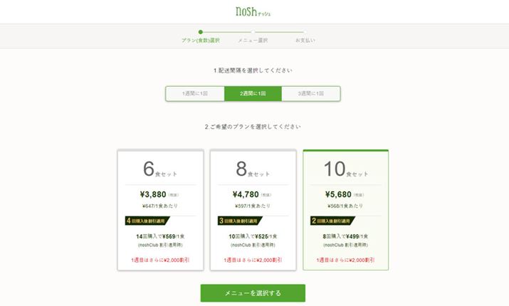 「nosh」の場合、一度に何食分届けるかによって、料金プランが変わってくる。最低注文量は6食で、6食、8食、10食の計3プランが用意されている。今回はその中から、人気No.1とうたわれている10食プランを選択。2週間(営業日5日×2)に分けて毎日1食ずつ食べることにした。なお、配送の方法としては、1週間に1回、2週間に1回、3週間に1回の3通りから選ぶことができる。