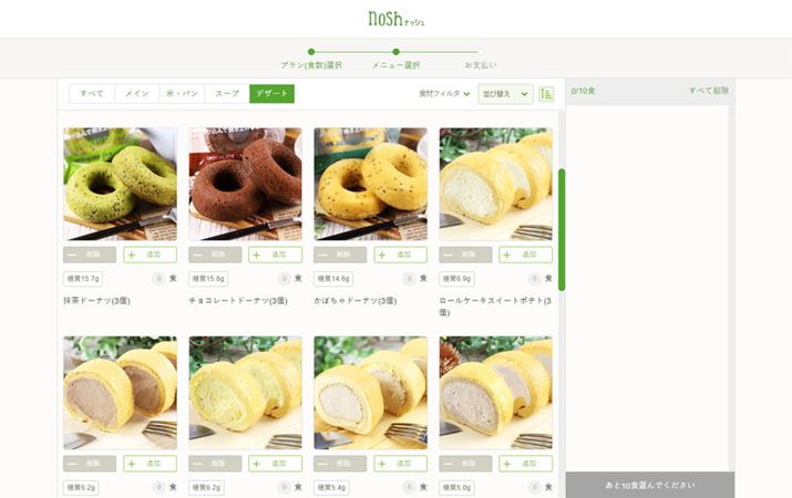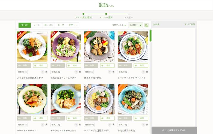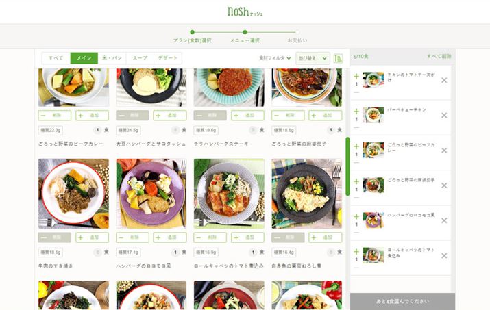 この中から、今回筆者が選んだのは「nosh(ナッシュ)」というサービス。選べるメニューが多く、好きなものをチョイスできそうというのが大きな理由だ。なお、この「nosh」のメニューは比較的値段が安めだが、メイン、米・パン、スープ、デザートの4種類に分けられているので、たとえば「メイン+米」のような選び方をすると、やはり1,000円を超えてしまう。そこで今回はひとまず炭水化物は選ばず、いわゆる「おかず」のメインだけを中心に注文してみることにした。