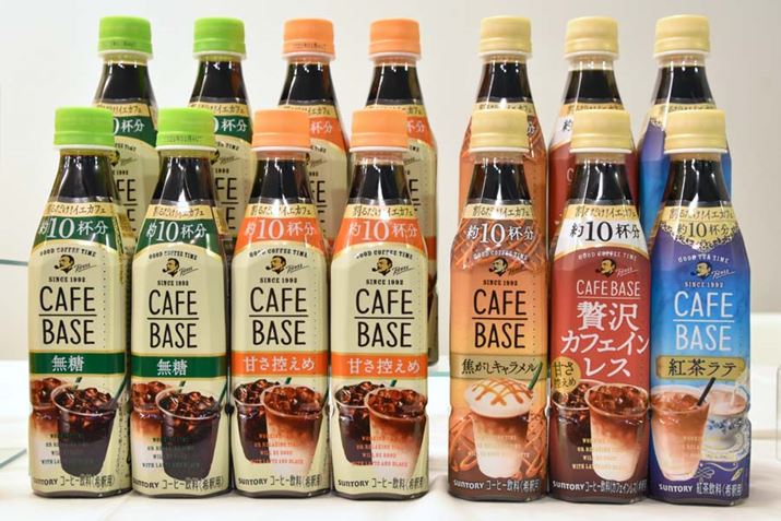 従来の「ボス ラテべース」との違いは、5つのラインアップ中、「無糖」「甘さ控えめ」「贅沢カフェインレス」の3製品がラテとブラックの兼用化を実現したこと。水で割っても牛乳で割っても楽しめるようになった。