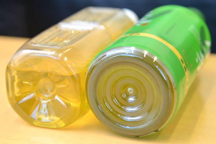 2016年に筆者が撮影した、大リニューアル前後の「キリン 生茶」。両端のボトルが第1章の最終モデルで、中央が今に続く新たなDNAを宿したニュータイプです。ガラス瓶をモチーフにしたスタイリッシュなボトルは、停滞気味だった緑茶市場にセンセーショナルな話題を巻き起こしました
