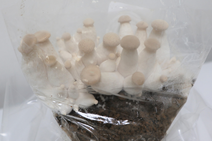 しいたけはブロックを水洗い後、付属の土をかけ、袋の上部をふんわりと閉じます