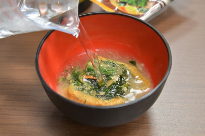 フリーズドライの味噌汁は、お湯を注ぎ、かき混ぜるだけですぐに完成。なかには、「かに」、「ふぐ」といった豪華な食材が入る商品も。具材が比較的自由なのもフリーズドライの特徴です