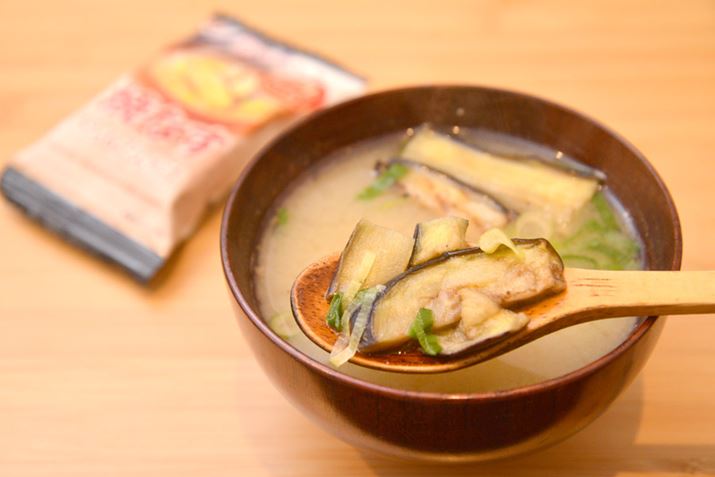 まろやかな合わせ味噌と、かつおと昆布の合わせダシによるスタンダードな味噌汁。具材にはトロッと仕上げたなすを入れ、食感を楽しめるようにしています。