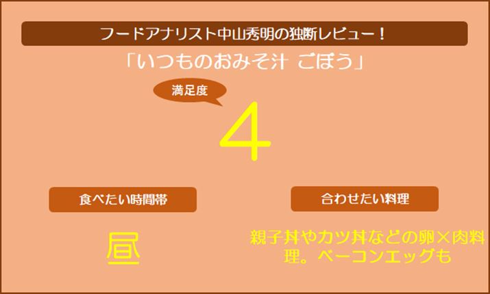 ジャクッとしたごぼうの食感が楽しいですね。シャープな塩味の中に、油揚げがしっかりとしたボディを作っているのが好印象。ねぎやわかめもいい仕事をしていて、総じてクオリティが高いと思います。卵のマイルド感がある料理に合うでしょう。