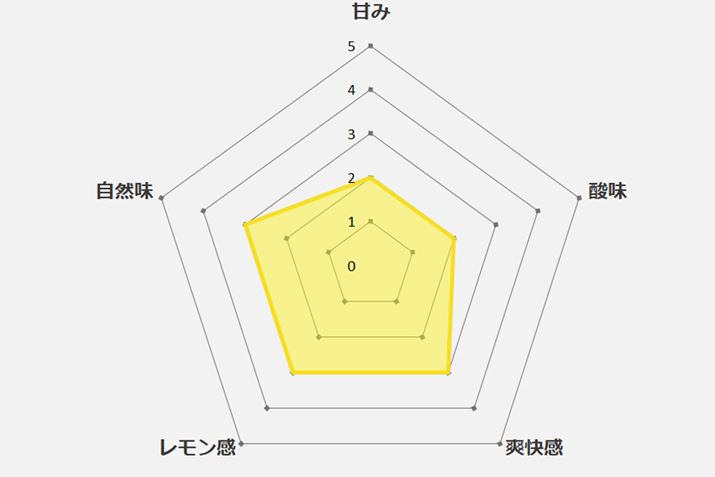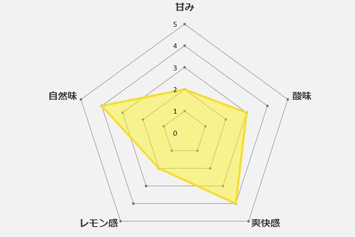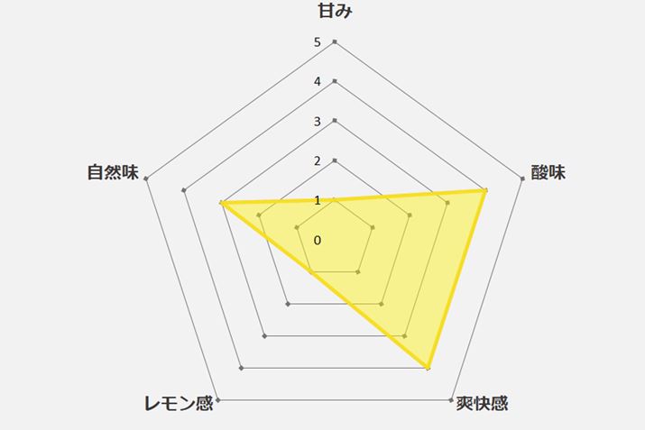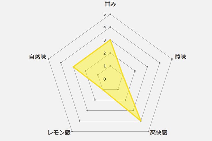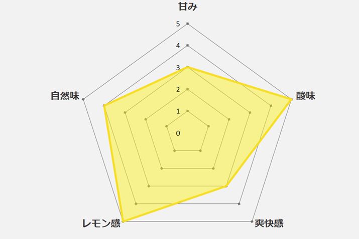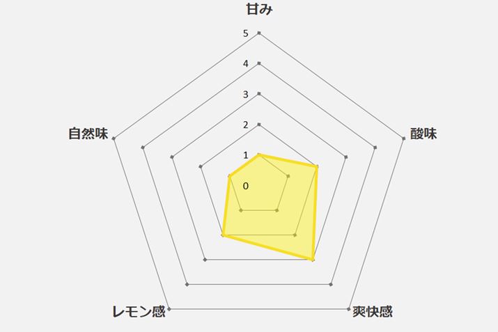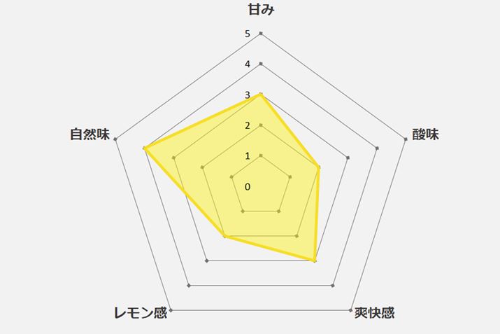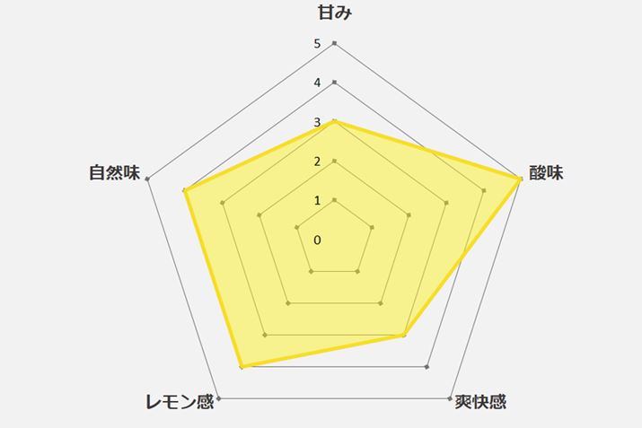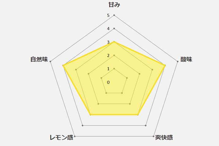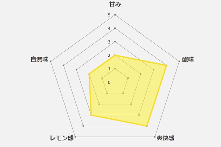 味は非常にビビッド。特に、思わず口がキュッとすぼまるような酸っぱさが印象的です。今回酸味は5としていますが、6〜7でもいいぐらいのパンチ力。とはいえ飲みにくさはなく、甘さもそれなりにあっておいしく飲めるテイストになっています。濃縮感があり、そこには「ポッカレモン」のDNAも。さえるほどシャッキリさせたいとき、エネルギーチャージをしたいときにはイチオシのレモンドリンクです。