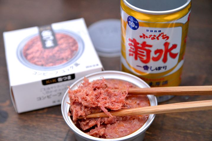 ゴマ油は香りの演出だけでなく、しっとりとしたテクスチャーを加えていて、コンビーフにありがちなドライな感じがないのもイイ! 「ふなぐち」は、コンビーフが持っていない甘みを補う形でマッチして、新しいおいしさが楽しめます。