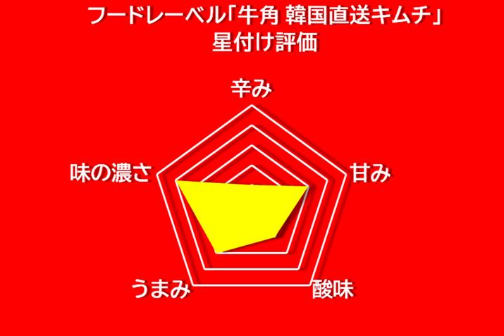 辛みが弱めで甘みは豊か。総じて味は濃いめで、焼肉にも負けないパワーを感じさせるところは、さすが「牛角」のキムチです。