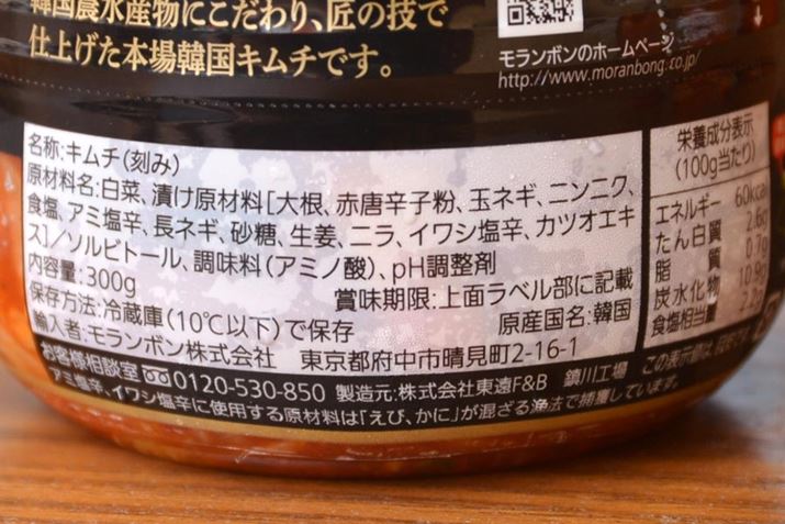 白菜、唐辛子、塩辛など、主要な原材料は韓国農水産物を厳選し、本場韓国ならではの技術で作り上げたモランボンの「韓キムチ」。アミ塩辛とイワシ塩辛のコクと、白菜のシャキシャキした食感が特徴で、植物性乳酸菌が生きた、本格的な熟成キムチです。