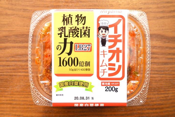 国産白菜を始め、厳選した原料と自社製造のヤンニョムを使用し、リンゴの甘みと塩辛のうまみを重視した味付けが特徴の「イチオシキムチ」。「プレミアム植物乳酸菌LB27」が1,600億個も入っているので、健康志向の人にもオススメです。