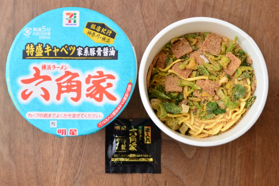 なお、商品名に付いている「銘店紀行」というのは、「セブンプレミアム」のカップ麺のいちシリーズ。そして「キャベチャー」というのは、キャベツとチャーシューをゴマ油と醤油で和えたもので、「六角家」が元祖だとか。ほかの家系ラーメン店でもしばしば見られるので、その功績はかなりのものでしょう。