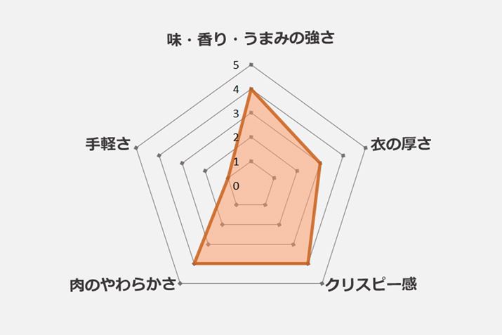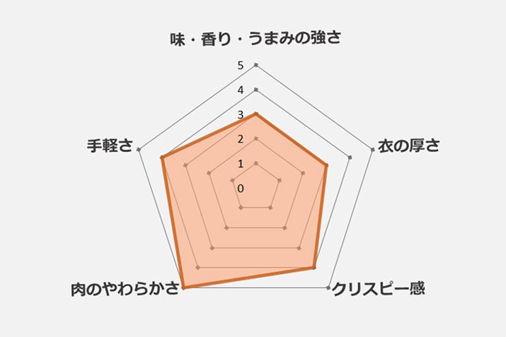 水溶きタイプゆえか、衣がバリッとたくましい食感で、やわらかい肉とのコントラストが絶妙です。味は想像どおりのパンチあるテイストで、濃厚さも十分。育ち盛りのわんぱくキッズにはすごくよろこんでもらえる味だと思います。