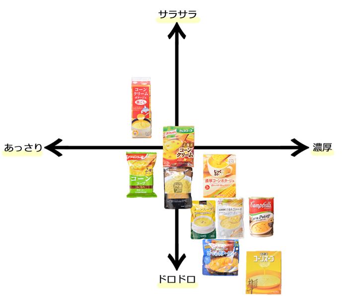 全10種類のコーンスープを飲み比べた結果をもとに、味わいの分布表を作ってみました。ぜひ参考にしてみてください。