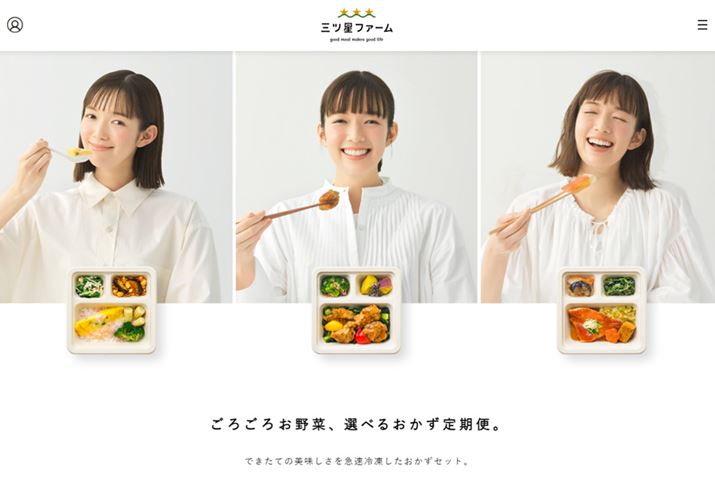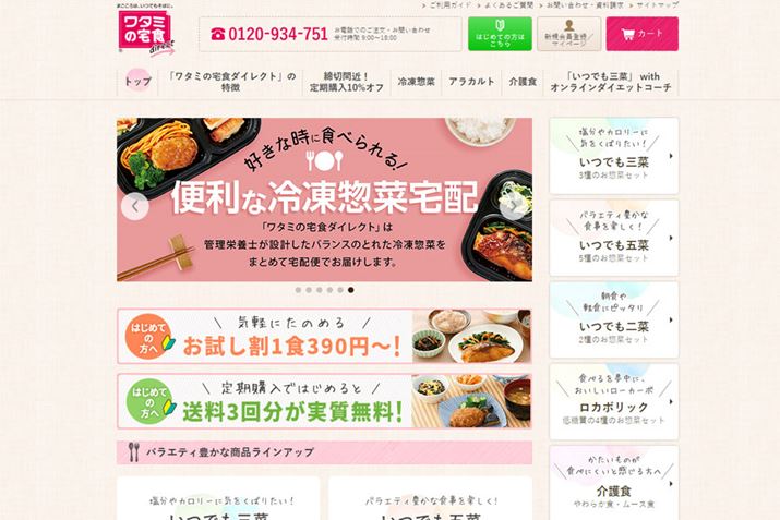居酒屋「和民」で知られるワタミが展開中の宅食サービス。どちらかと言えば、高齢者層に強いサービスとして知られる。メニューは、3種のお総菜「いつでも三菜」と5種のお総菜「いつでも五菜」の2セットがあり、前者の場合「10品目以上で250kcal基準。食塩相当量2.0g以下」という基準でメニュー設計されている。料金は、定期購入の場合、「いつでも三菜」は500円/食、「いつでも五菜」は600円/食(配送料別)。