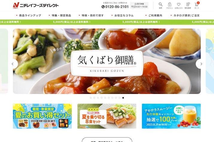 冷凍食品でおなじみ、ニチレイが手がける宅配弁当サービス。健康な食生活を目指す「ヘルシー食品」、食事管理に最適な「健康管理食と健康サポートアイテム」、本格的な味の「こだわり素材と厳選グルメ」という3カテゴリーで、かなり多数のメニューを用意。カロリー、糖質、塩分を控えたい人のための「気くばり御前」では、70セットほどのメニューを揃えている。料金はセットによるが、1食800円前後から(配送料別)。