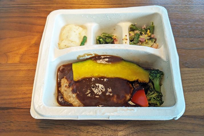 600Wのレンジで6分温めたら準備完了。フタをめくると、なんとも美味しそうなハンバーグが登場した! 箸を進めてみてこれまたびっくり! とても美味しい。以前にnoshの実食レビューをやったときよりもむしろ味が進化してないか? 実に本格的なハンバーグの味に十分満足! 付け合わせも、ポテトサラダ、アスパラベーコン、ズッキーニエッグと凝っていて、食べ応えあり。この日はさほどおなかが空いていなかったこともあり、昼食はこのメニューのみ。でも満足でした!