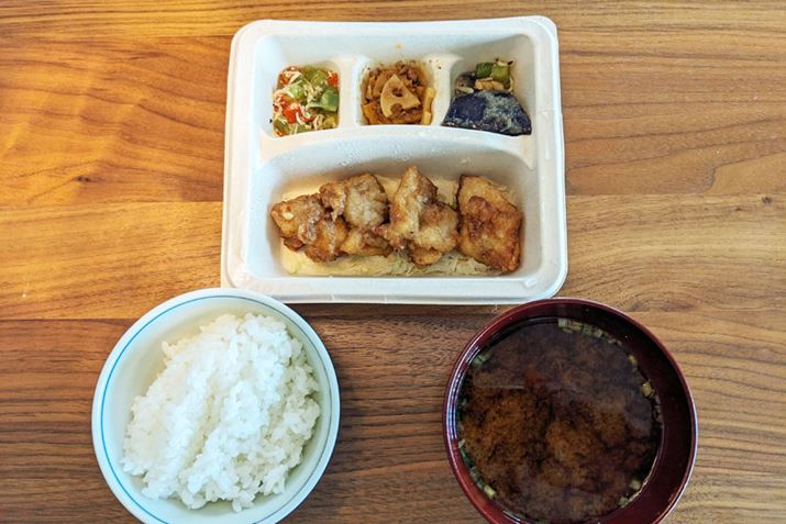 付け合わせは、きんぴら、じゃこピーマン、なすのおろししょうが。どれも量は少ないものの、しっかり味付けもされていて美味しい。しかし、最近の冷凍食品の唐揚げって本当に美味しいですね。実によくできてる。