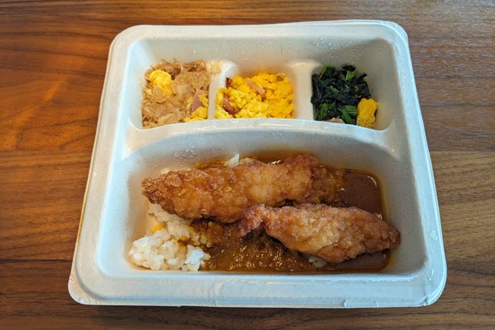 さらにフタを開けてみてさらにビックリ! なんとカレーライスの上には、揚げ物(鶏唐揚げ)が2個も乗っているではないですか! え、これで本当に385kcalなの? 本当に目を疑うレベルです。
