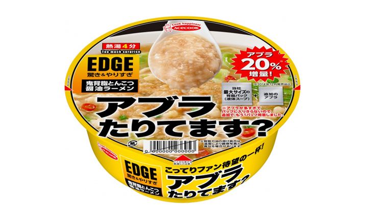 「驚きとやりすぎ」を追求したEDGEシリーズの第4弾として発売された「鬼背脂とんこつ醤油ラーメン」がさらに進化! 今年は、背脂の量が20%増量(2014年12月発売品比)され、おいしさとやりすぎ感がさらにアップしました。肝心の中身はというと、しっかりとした噛み応えのある太麺に、シャキシャキとした食感のキャベツ、風味のよい揚げ玉、きれいな色調のねぎ、唐辛子などのかやくをプラス。スープは、ポークをベースにした豚骨醤油味です。この姿はまさに、カップ麺版の「二郎インスパイア系」なのでは!?