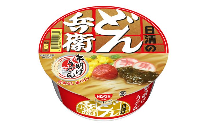 もうすぐ年末。今年もまた、和風カップ麺のロングセラーブランド「日清のどん兵衛」から、この時期恒例の「年明けうどん」が発売されます。もっちり白くて太いうどんと、昆布だしをきかせたつゆに、紅白の「梅干し」や「よろこんぶ (よろこぶ)」に通じる「とろろ昆布」、長寿を願う「寿かまぼこ」など、おめでたい具材を揃えました。同時発売の「日清のごんぶと 年明けうどん」には、「めでタイ」にかけた「鯛入りつみれ」や「運気をアゲる」にかけた「きざみあげ」などが入っています。縁起のいい年明けうどんを食べながら、よい年を迎えましょう。