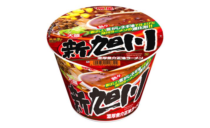 こちらの記事でもご紹介した通り、北海道は言わずと知れたラーメン激戦区。札幌の味噌、函館の塩とともに「北海道の3大ラーメン」と言われているのが旭川の醤油ラーメンです。ポイントは、動物系と魚介系のだしを合わせたWスープの表面を焦がしラードで覆い、冷めにくくしている点。この旭川ラーメンをさらに進化させ、焦がしラードの代わりに焦がしネギ油と焦がしネギチップを組み合わせたのが「明星 大盛 新旭川濃厚魚介正油ラーメン」となります。表面はなめらかですが、しっかりとした弾力のある中太油揚げ麺が、風味豊かに仕上げた濃厚なスープによく絡みます。進化した旭川ラーメンをお楽しみください。