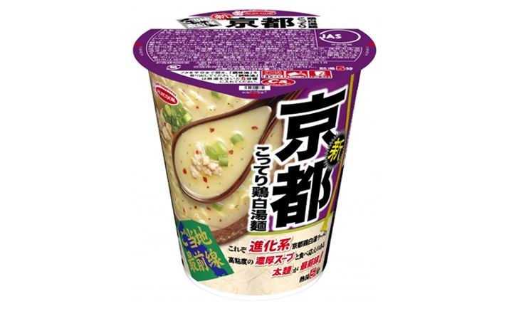 人気のご当地ラーメンをテーマにした「ご当地最前線」シリーズの新作は、京都の濃厚白湯系ラーメンを再現した「ご当地最前線 京都こってり鶏白湯麺」。数種類のチキンエキスを使用し、鶏の旨みを徹底的に引き出した鶏白湯スープは、粘度感のある濃厚な味わい。別添の山椒や黒胡椒、調味油を加えることで、最後まで飽きのこない味わいを楽しめます。麺は、濃厚なスープによく合う、食べ応えのある角刃の太麺。旅行ガイドブックをイメージしたデザインのパッケージを見ながら食べれば、京都旅行の気分が楽しめるのでは。