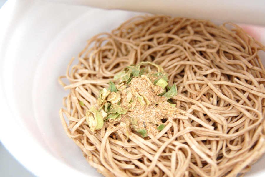 次に、「かき揚げ天ぷらそば」を試してみることにしましょう。これも手織里庵シリーズですが、手延べそうめんと異なり、ヤマダイの独自製法のノンフライそばを使用しています。なお、このそばには、挽き立てのそば粉が4割ほど配合されているとのこと。実際に食べてみると、確かにそば粉の風味や食感は「そば」そのもの。カップ麺を食べている気がしません。