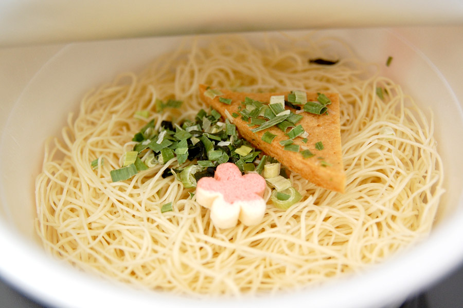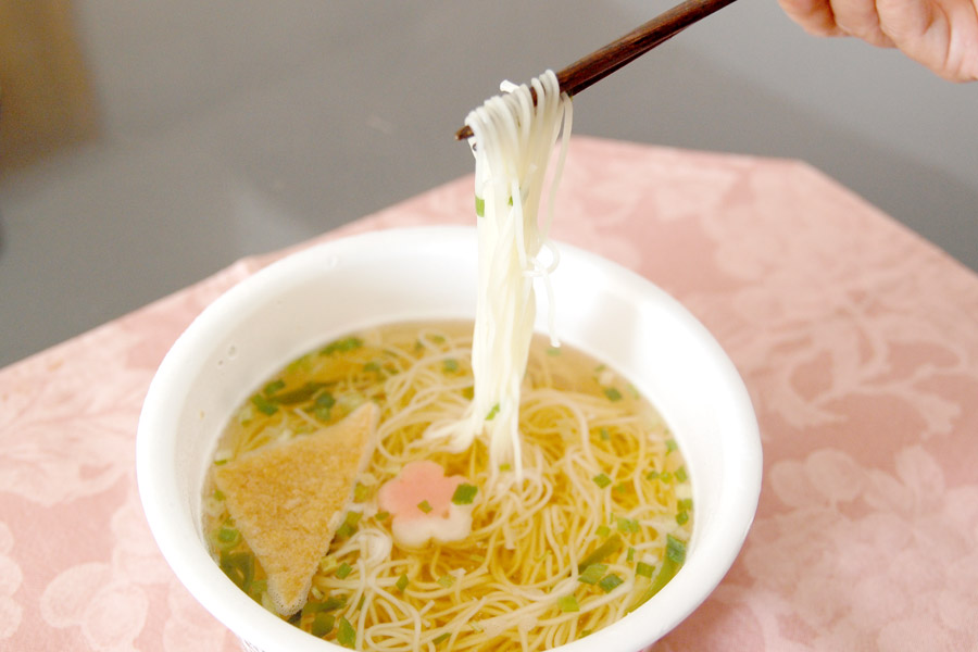 ちなみに「揖保乃糸」とは商品名ではなく、兵庫県手延素麺協同組合が持つ商標のこと。揖保乃糸をくるむ帯には生産者番号がつけられており、厳格な品質管理が行われているそうです。確かにヤマダイの「手延べそうめん」に入っている揖保乃糸も、ツルツルとした心地よいのどごしが楽しめます。食感は、よく夏に食べる揖保乃糸そのもの! インスタント感は全くありません。そうめんを温めて「にゅうめん」にすると、まさにこんな感じ!という味です。