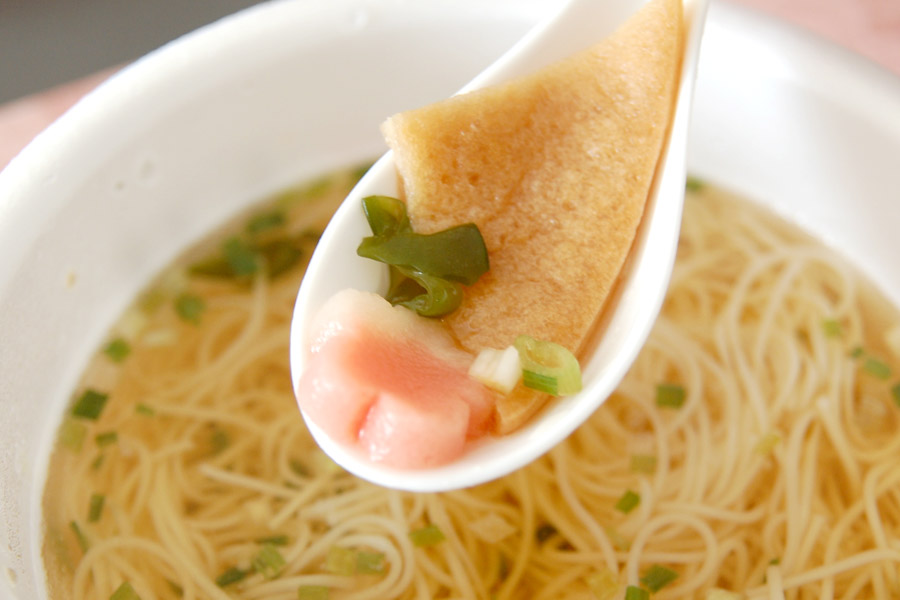 スープは、昆布と鰹節のダシが効いたスッキリした味わい。揖保乃糸との組み合わせが絶妙です。カップから丼に器を変えれば、「にゅうめん」としてお店に出してもおかしくないほど。具材は、油揚げと麩、ネギ、メカブの4つ。カップ麺にしては、リッチです。麺をすすると、揖保乃糸のツルツルという食感と、メカブのコリコリという食感の違いを楽しむことができます。「手延べそうめん」は、想像以上にカップ麺らしからぬ本格派でした。