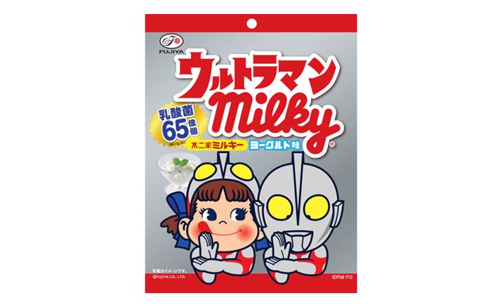 放送開始から50年を迎えた「ウルトラマンシリーズ」と、発売65周年を迎える「ミルキー」がコラボレーションして「ウルトラマンミルキー」になりました! パッケージには、コスプレ姿のペコちゃんがウルトラマンと並んで「スペシウム光線」のポーズをとっています。1袋に1枚付いてくる再封シールは、ウルトラ怪獣のコスプレをしたペコちゃんなど全10種類を用意。キャンディの個装紙にも、ウルトラヒーローやウルトラ怪獣の模様が入っています。味は、さわやかなヨーグルト風味。ミルキー発売65周年に合わせて、1袋当り乳酸菌が約65億個入っているとか。このほか「ウルトラマンミルキー」「ウルトラマンスカッシュキャンディ袋」「ウルトラマン復刻シールチョコ」など、計4製品をラインアップ! ペコちゃんファンと円谷プロファンは、この機会をお見逃しなく!