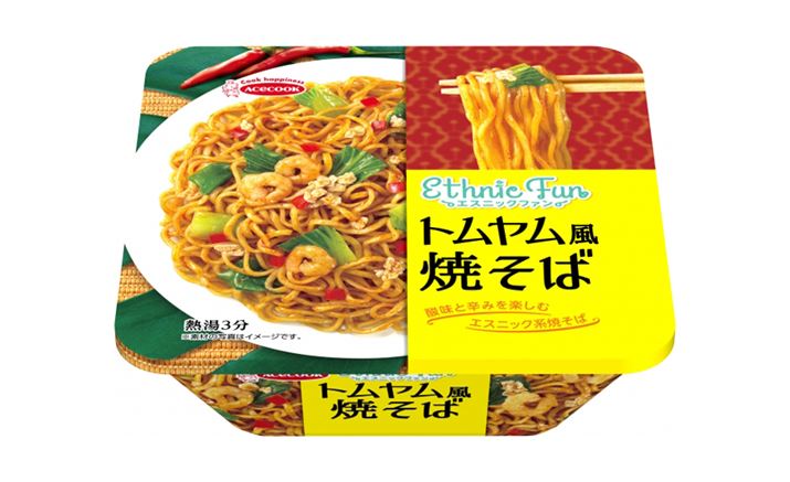 刺激的な辛みと絶妙な酸味が魅力のトムヤムクンの味わいを、即席めん業界のトレンドである汁なし系カップめんで再現したのが「エスニック FUN トムヤム風焼そば」。ポークエキスに豆板醤や唐辛子を加えた濃厚ながらも辛味のあるタレに、豆板醤や唐辛子をあわせ、さらに蝦醤(小エビを塩漬けにして発酵させたペースト状の調味料)や魚醤を加えることで、トムヤムクン独特の「後を引く味わい」に仕上げました。かやくは、プリっとした食感のよい海老と、ほどよく味付けした鶏肉そぼろ、色調のよいチンゲン菜、赤ピーマン。エスニックファンも満足なカップ麺です。