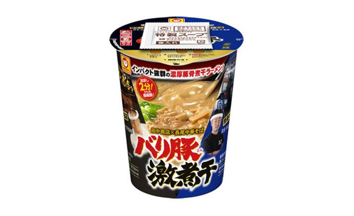 全国的に知名度が高く、エリアの異なる有名店2店がコラボレーションした「夢のWコラボ」シリーズの第7弾は、「博多長浜ラーメン 田中商店」(東京)と「長尾中華そば」(青森)とのコラボで実現したカップ麺「マルちゃん 縦型ビッグ 田中商店×長尾中華そば バリ豚激煮干」。田中商店の博多豚骨ラーメンと、長尾中華そばの津軽煮干しラーメンをコンセプトに、両店の特徴を生かしたカップ麺に仕上げました。スープは、ポークをベースに煮干しの香りとうま味を効かせた濃厚豚骨風味。麺は、硬く歯ごたえのある極細の丸麺です。別添の醤油スープを加えると、さらに味が引き締まります。