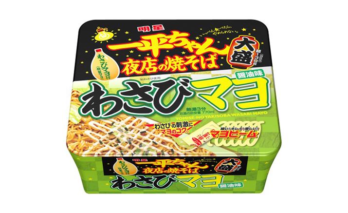 焼きそばに辛子マヨネーズをかけて食べるのは定番ですが、今回発売する「明星 一平ちゃん夜店の焼そば 大盛 わさびマヨ 醤油味」にかけるのは何と、わさびマヨネーズ。ポークと魚醤のうまみが効いた醤油ダレに、わさび風味の調味油を合わせたソースをかけて、「特製わさびマヨ」を加えると、辛みとコクが増します。さらに、仕上げのふりかけは、わさびシーズニングパウダーとわさび風味顆粒。まさに、わさびづくし! ふりかけに入れたのりの風味がわさびとマッチして、一度食べたらクセになる味です。