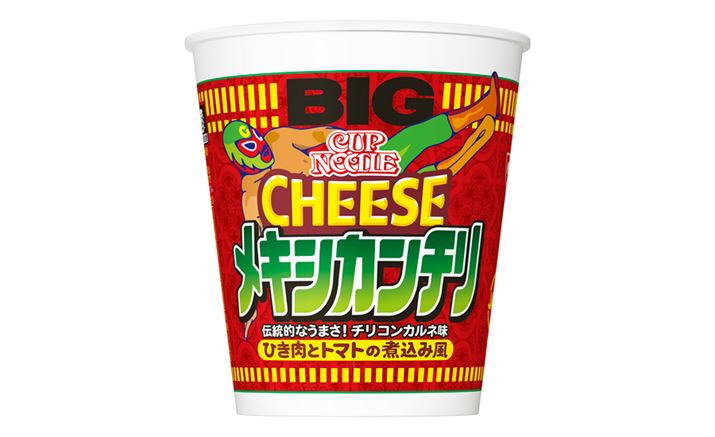 「世界の名物料理」をテーマにしてきた「カップヌードル ビッグ」シリーズ。第5弾は、メキシコの伝統料理「チリコンカルネ」をカップヌードル流にアレンジした「カップヌードル チーズメキシカンチリ ビッグ」です。「チリコンカルネ」とは、ひき肉とタマネギを炒め、トマトや豆類、チリパウダーなどを入れて煮込んだメキシコ料理。この味をイメージし、ひき肉とトマトのうまみに、チーズの風味とチリスパイスの辛みを効かせた味わいに仕上げました。具材は、チーズ、ダイスミンチ、レッドベル、キャベツ。メキシコ料理独特の味わいを楽しめるカップ麺です。ドロップキックを放つルチャドール(メキシコ流プロレス「ルチャリブレ」のレスラー)のパッケージイラストもカッコいい!