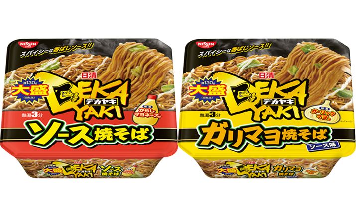 130gの麺を使用した大盛りサイズの焼そば「日清のでかやき大盛」ブランドが「日清デカヤキ」に改名。その第1弾として、「日清デカヤキ ソース焼そばからしマヨネーズ付」をリニューアルするとともに、「日清デカヤキ ガリマヨ焼そばソース味」が新たにラインアップに加わります。「ガリマヨ」という名の通り、ローストしたガーリックの香りが効いたスパイシーソースと、ガーリックとたまごをミックスした特製ガーリックマヨを付属。ガーリックを練りこんだ中細麺と絡み合い、まさにガーリックづくしの一品! にんにく好きには中毒性が高い製品なので、十分ご注意を。