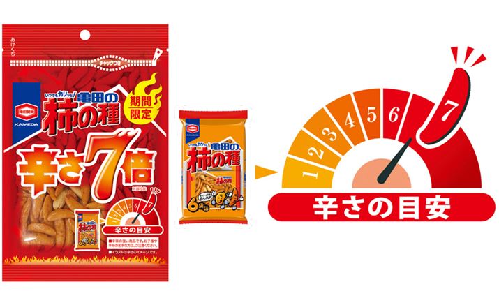 今年で発売50周年を迎える、亀田製菓のロングセラー商品「亀田の柿の種」。「もっと辛い柿の種を食べてみたい!」というリクエストに応えて、2014年と2015年に期間限定で発売されたのが「辛さ5倍」。カプサイシン(辛味成分)の量を基準として、通常の「亀田の柿の種」が辛さ1のところを、その5倍に増量しました。そして今年は、「まだまだ足りない!」というファンの声に応えて、辛さ5倍をさらに上回る7倍に挑戦! 秘伝のしょうゆだれをベースにチキンエキスなどのうまみを加えた「辛いけどやめられない!」味わいで、柿の種マニアも満足の逸品です。